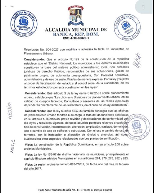 El Concejo de Regidores de la Alcaldía Municipal de Bánica, mediante la Resolución 004-2025, modificó y actualizó la Tabla de Impuestos de Planeamiento Urbano.