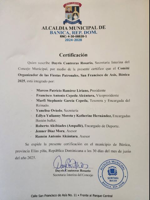 Por esta vía informamos la conformación del Comité Organizador de las Fiestas Patronales San Francisco de Asís, Bánica 2025.