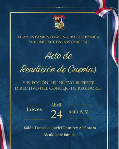 Ven y acompáñanos el próximo jueves 24 de abril, al acto de Rendición de Cuentas Municipal, correspondiente al período 2024-2025, el cual se llevará a cabo en nuestra alcaldía municipal.