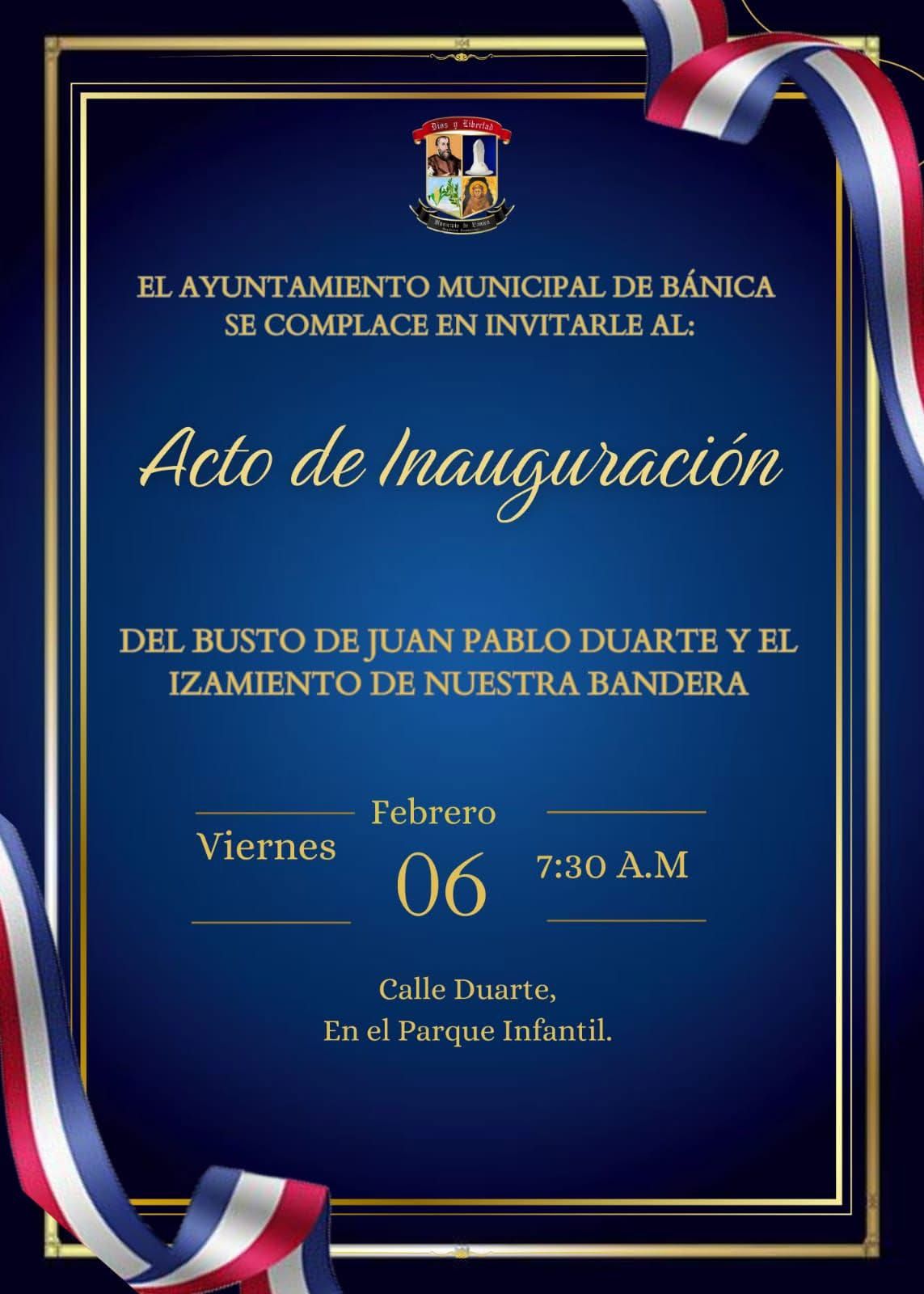 La Alcaldía Municipal de Bánica te invita cordialmente a la inauguración del busto de Juan Pablo Duarte, Padre de la Patria, mañana viernes en nuestro Parque Infantil.
